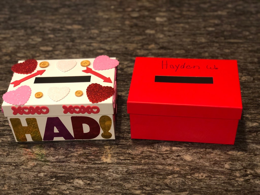 And, of course, a favorite school activity is the Valentine’s Day party / exchange. The kids aren’t having a big party at school with activities, but they are still exchanging Valentines and having a sweet treat in the afternoon. They were to bring a decorated box for the exchange. These decorated boxes couldn’t show the differences in Hayden and Hadley’s personalities more if they tried. Over the top vs simple. #thisismylife While Hadley decorated her box last week, Hayden said, “I’m just going to write my name on the box.” I figured he’d throw at least a heart or two on the box…but I guess he was serious about only putting his name. haha