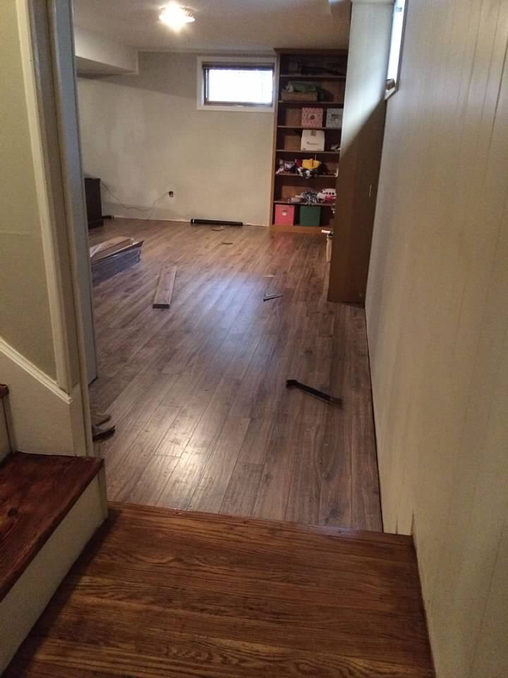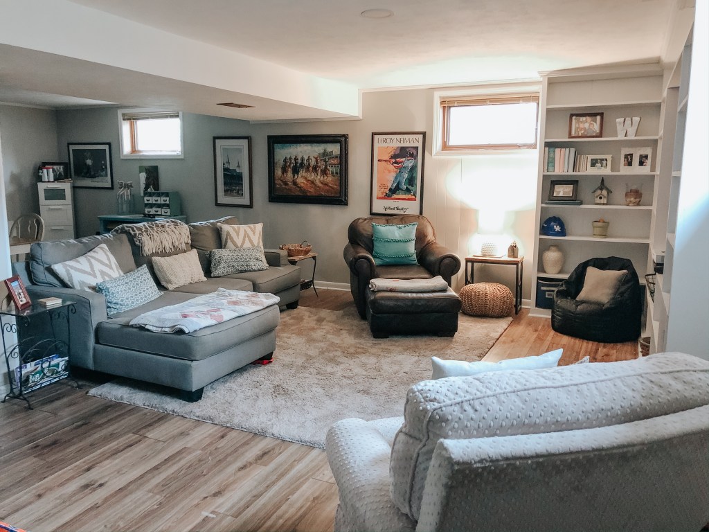 Then, a few months later, we had the flooring changed out. Our neighbors (who are our friends!) had the same flooring. It’s difficult for me to make decisions sometimes, so I love when I just see something I like that will work. The flooring is from Lowes, and it is Allen+Roth Weathered Oak. We went with the laminate flooring in case the basement ever floods, and it’s a high traffic area; we come and go through the basement multiple times a day.