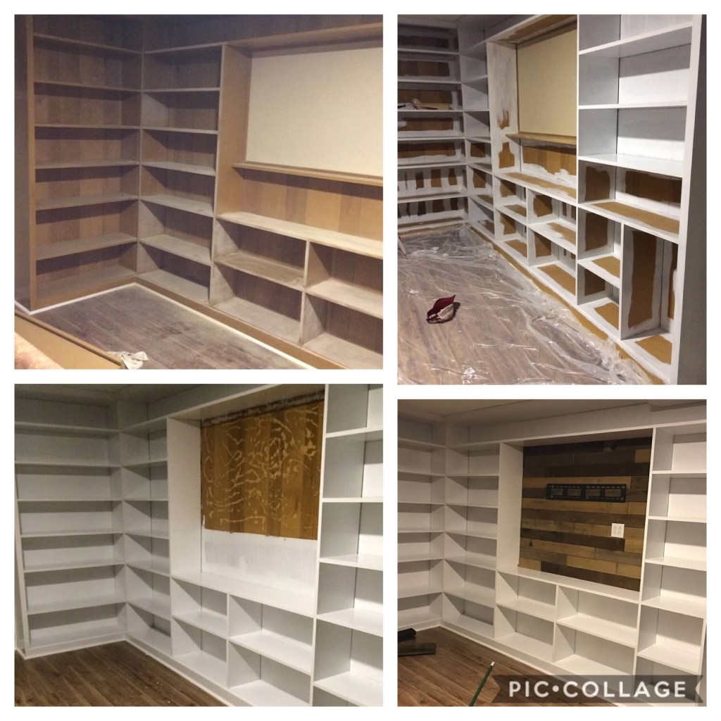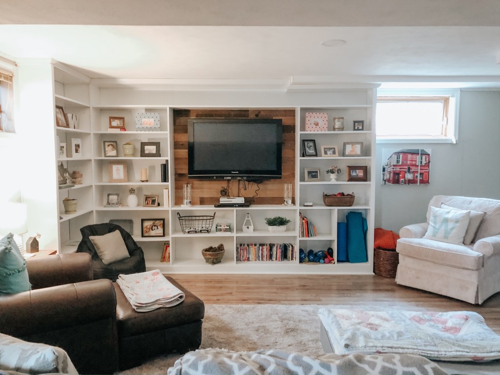 About two years ago, Travis decided to paint the bookshelves, and we rearranged the furniture (and got rid of our tv stand) to make the space work even better for us. Travis loves (or at least really doesn’t mind) painting. This was quite a project while sanding the shelves, painting multiple coats of white, mounting the tv, hiding the wires, etc. He did have a “vision” though and even chose the Weathered Hardwood Planks for the backdrop of the tv.