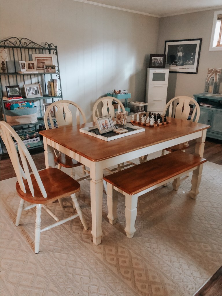 This is the area behind the couch. After we had our farmhouse table built for the kitchen, we put our previous kitchen table down here. We actually do use it a bit. If we have friends and family over, the kids come eat down here, I use the table space to wrap gifts, and the kids even do projects and crafts at the table.