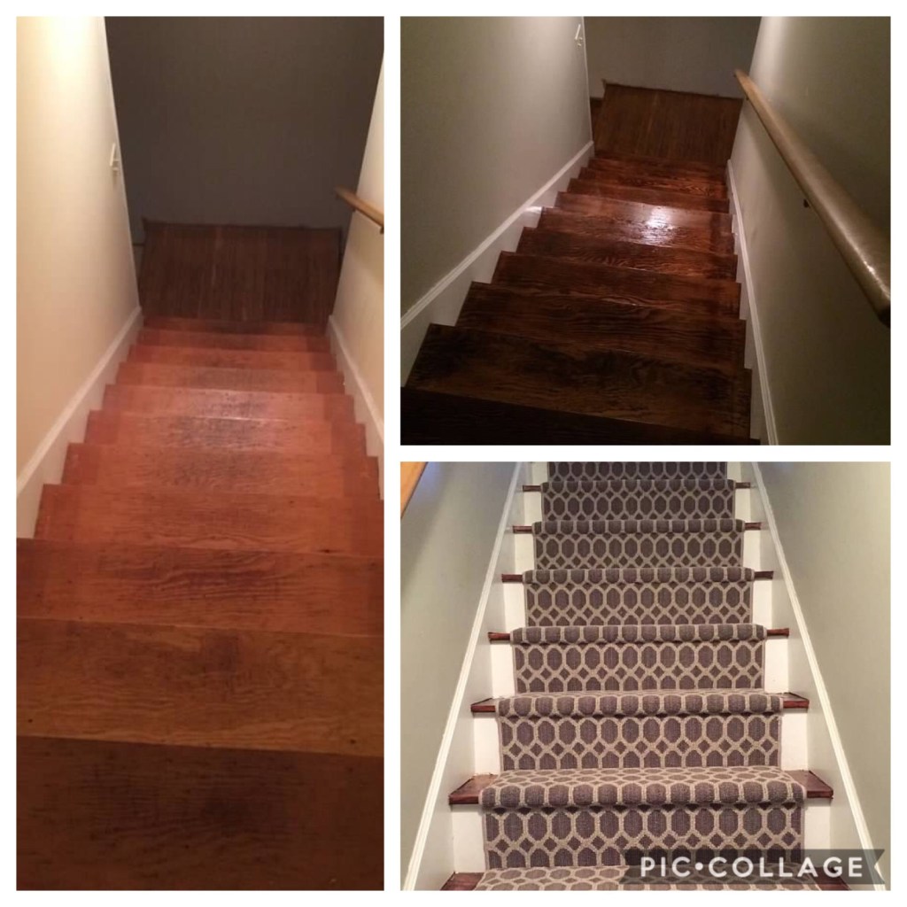 The original beige carpet on the stairs had seen better days. So, we had it ripped up and we hired someone to sand and stain the stairs. They were beautiful, and we left them as is for awhile. The problem was that we come and go from the basement as we have a raised ranch home. So, the stairs were pretty noisy. So, Travis painted the backs of the steps (and the walls leading down to the basement), and then we chose carpet for a runner. It’s definitely quieter as we go up and and down the stairs daily, and I love the pattern of the carpet that we chose from a local carpet store.