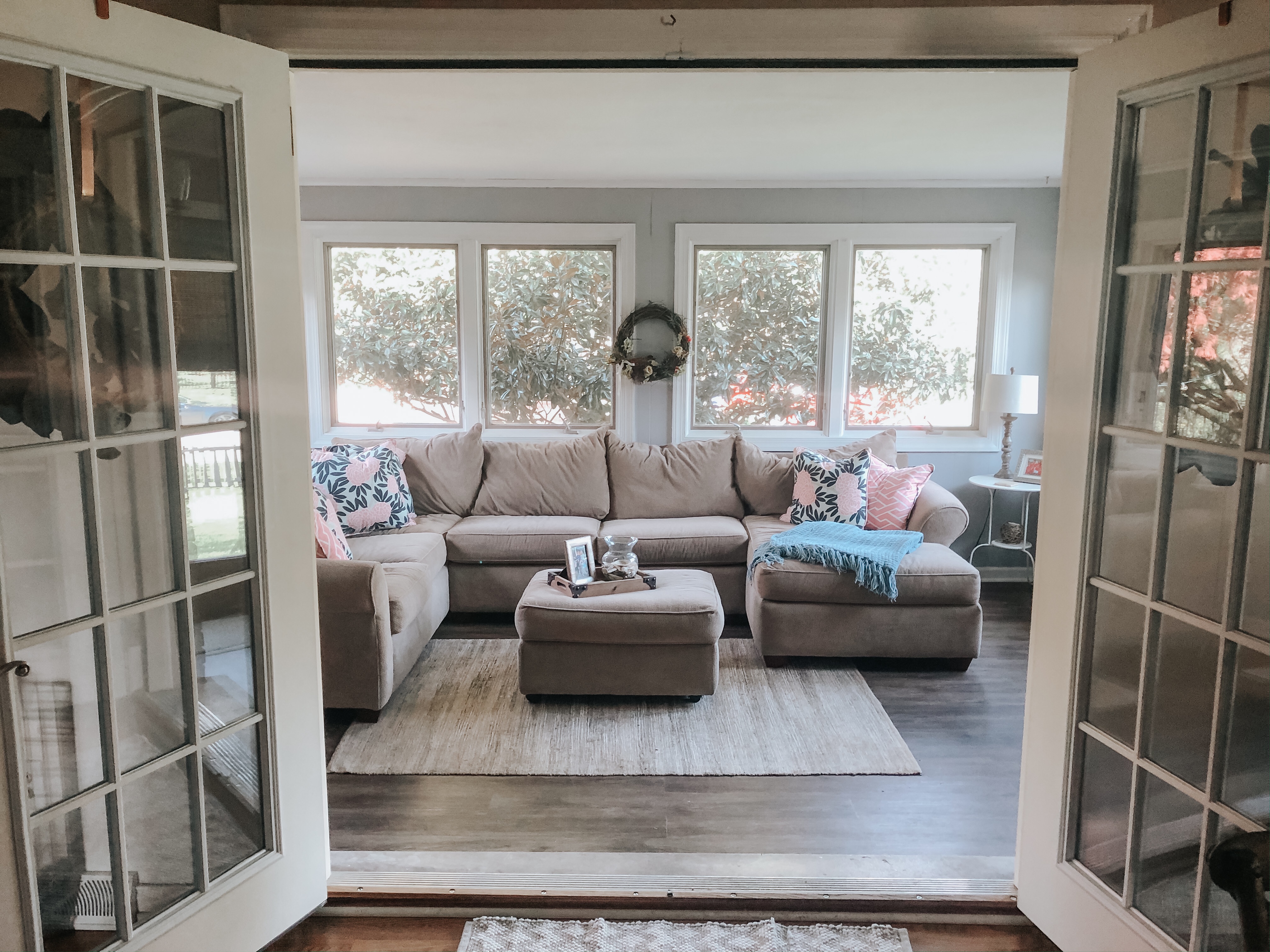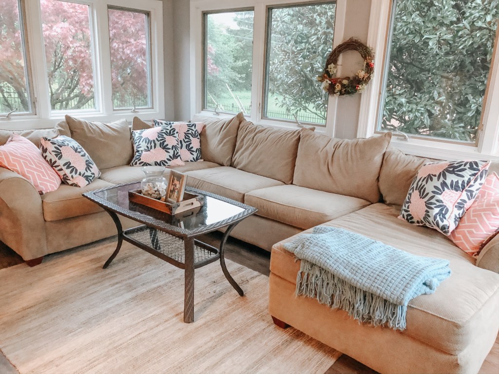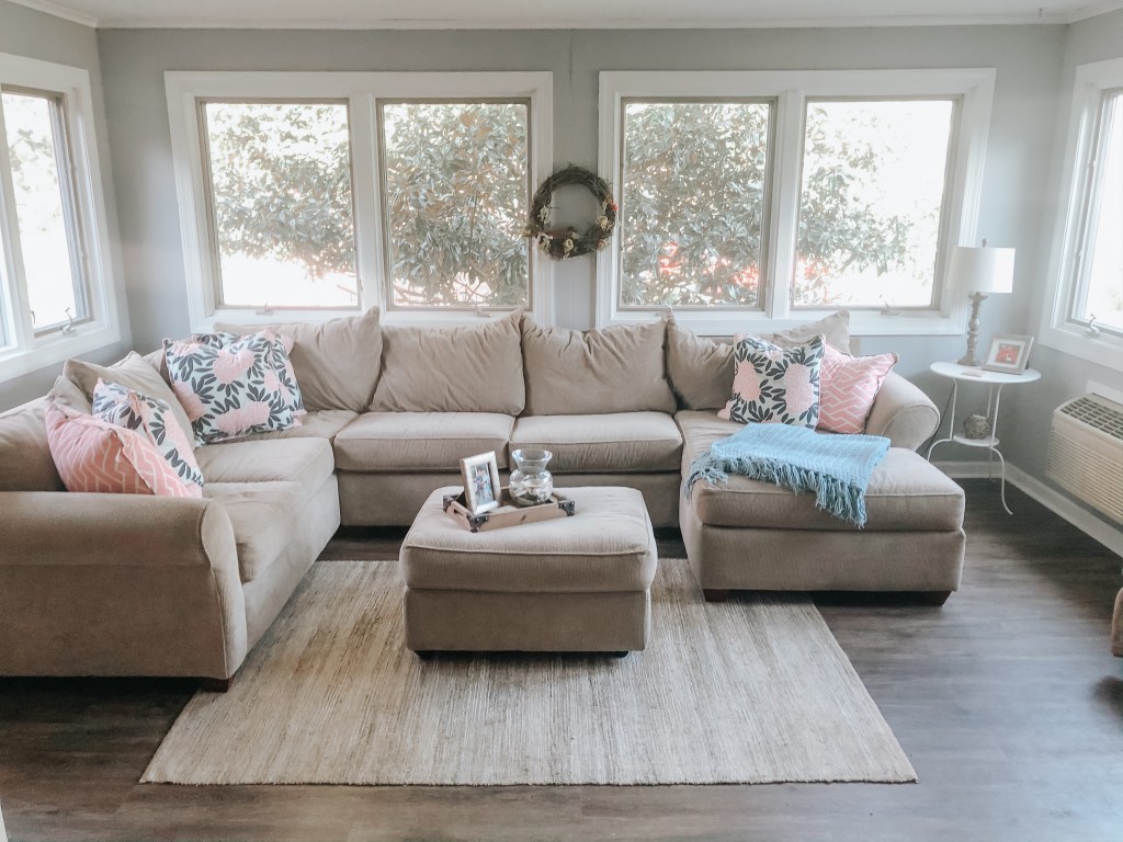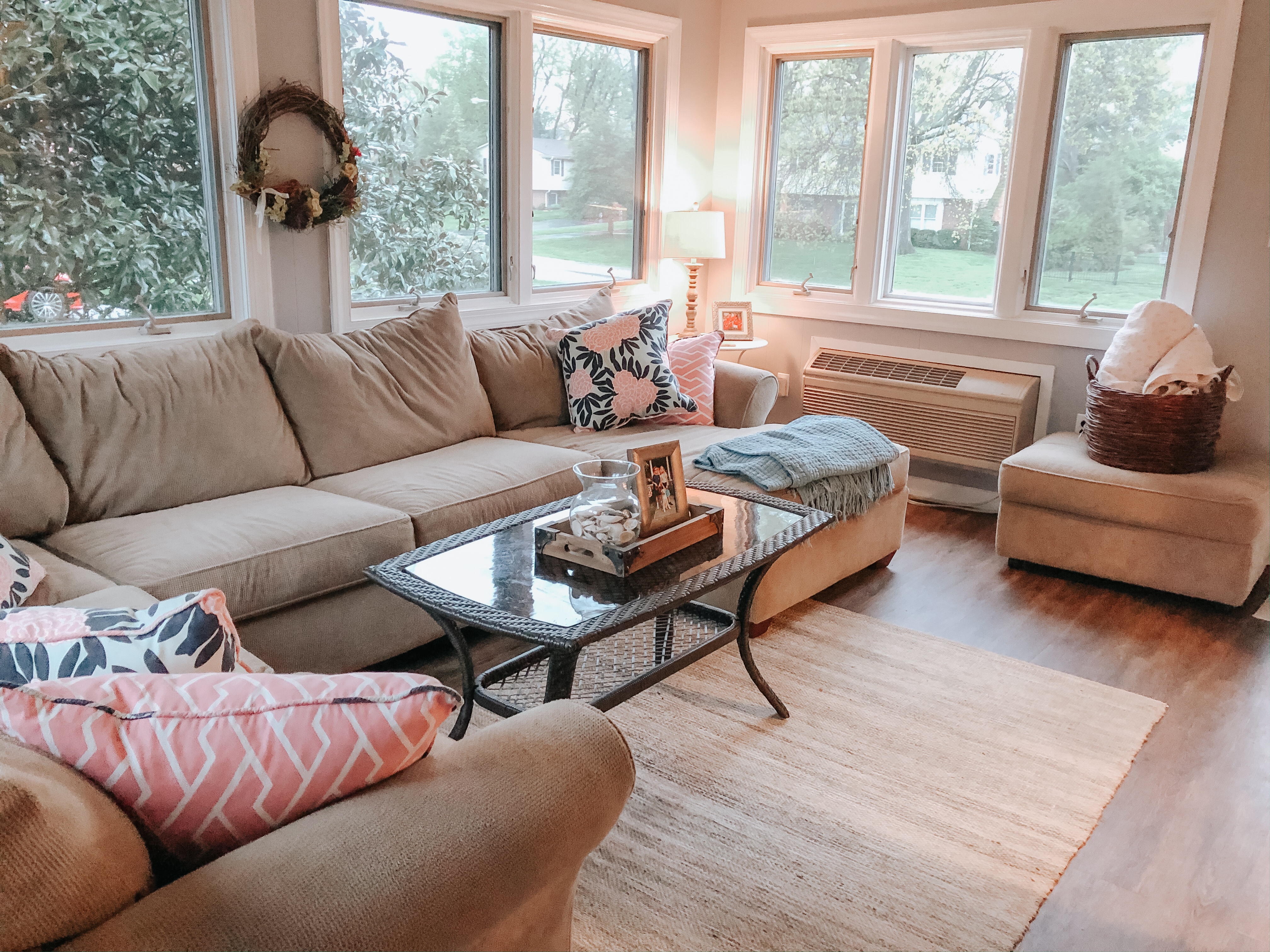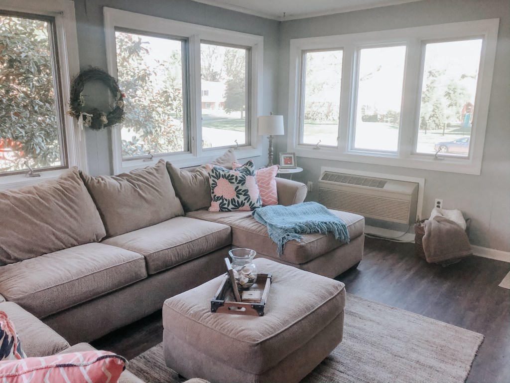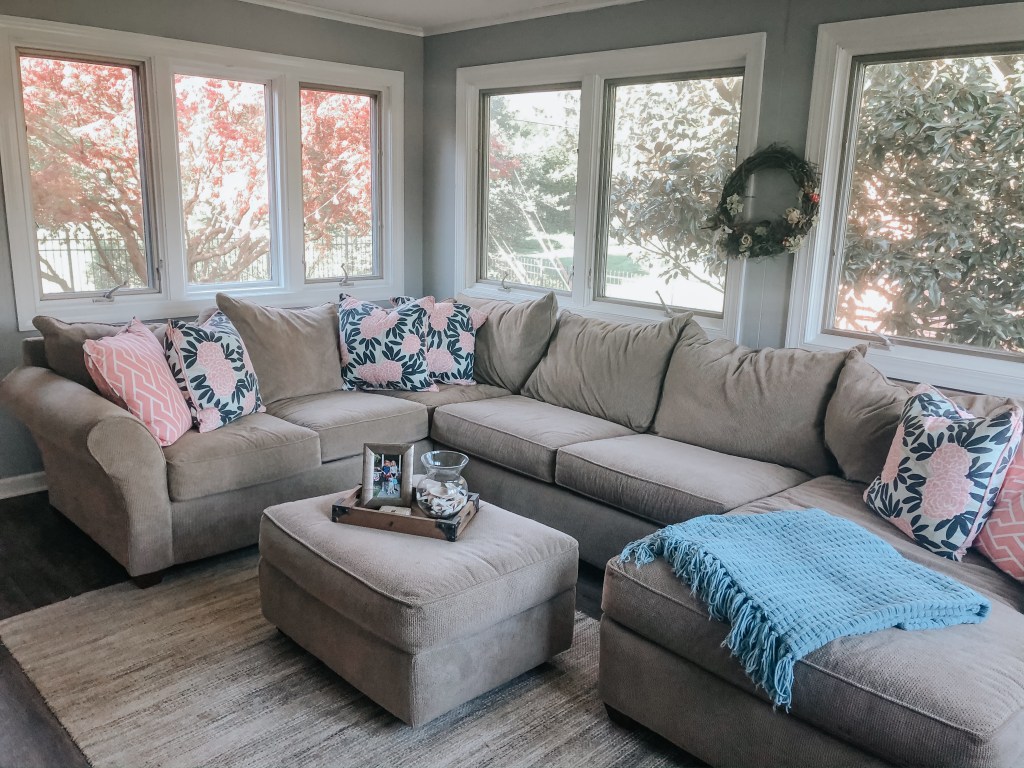 We’ve had this neutral sectional couch for almost ten years. It was in our basement in our previous house and didn’t fit quite right in our current basement due to the structural pole that I’m guessing holds up the house 😉 So, the neutral sectional takes up most of the sunroom, but it’s still a good spot to take a nap, read a book, or the kids’ have used this space to work on school work recently.