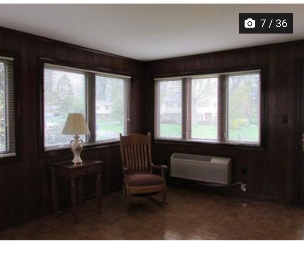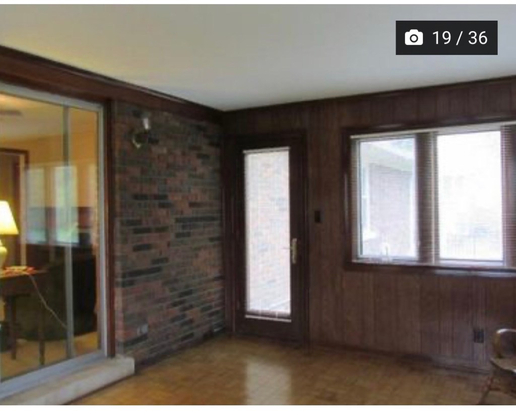 After only living here a few months, Travis painted the paneling in the the sunroom. After about a year, the parquet flooring was not holding up with two active kids and two dogs. The sunroom has two doors which is how we get to our backyard, so there’s lots of coming and going activity. When we were ready, our neighbor put down the waterproof flooring.