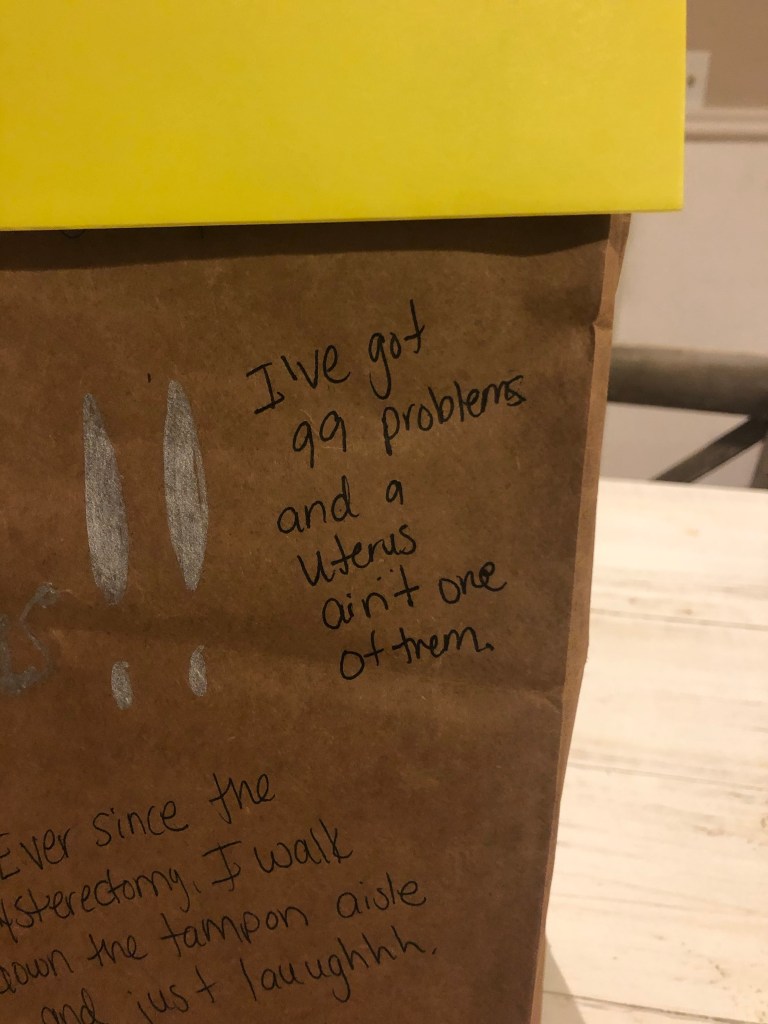 The night before my surgery, one of my friends brought over some food. She’d written funny sayings all over the paper bag. So funny and just what I needed.