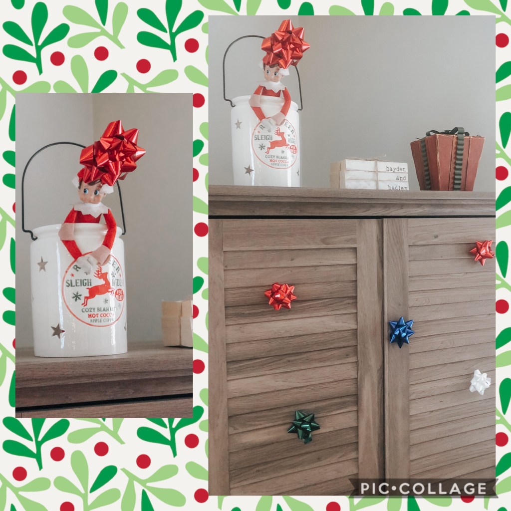 Our elf, Red, of course stuck around until the 25th. We found him hanging out after getting into our wrapping supplies!