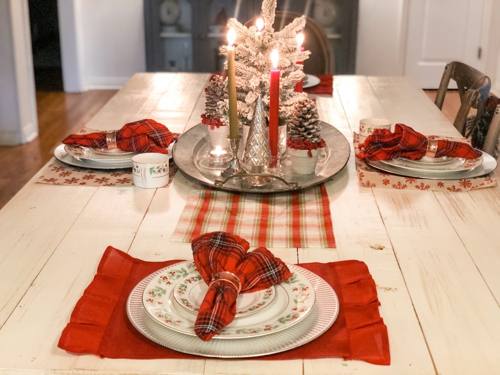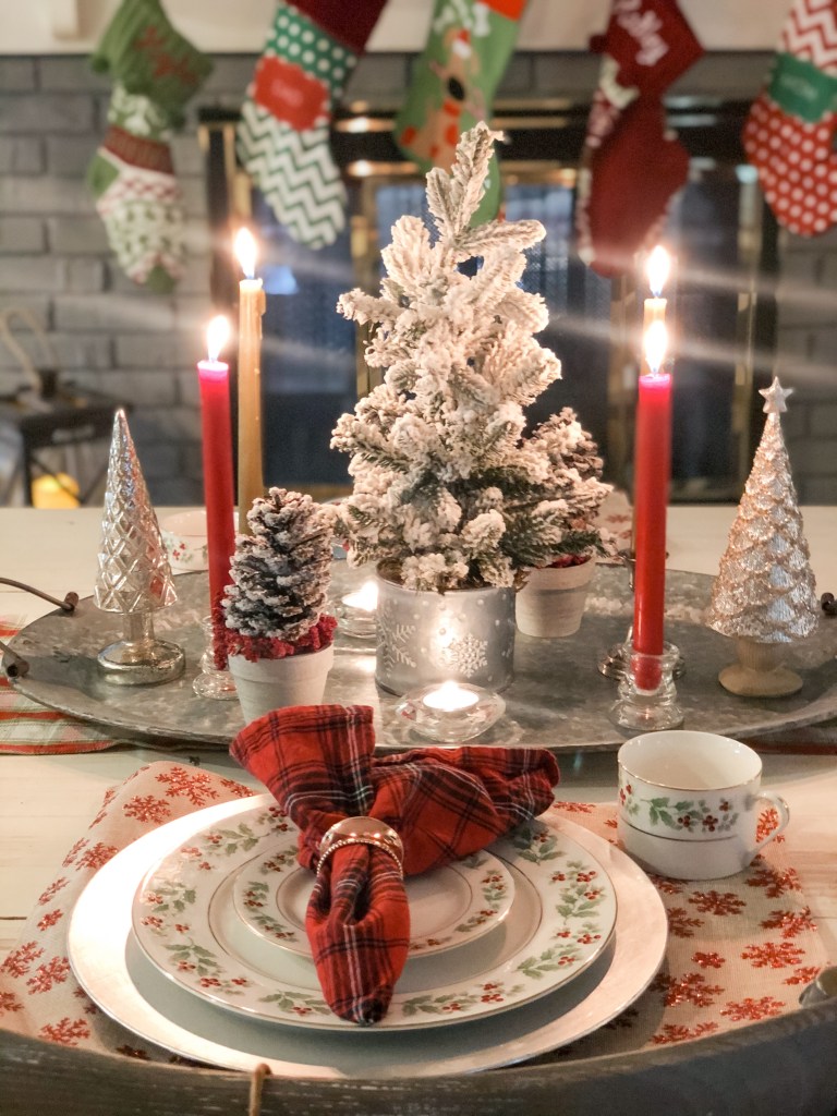 My grandma gave me these Christmas dishes a few years ago, and then I always add candles and a few decorations from around the house for the centerpiece. This year, I added trees and red and green candles to the kitchen table tray.