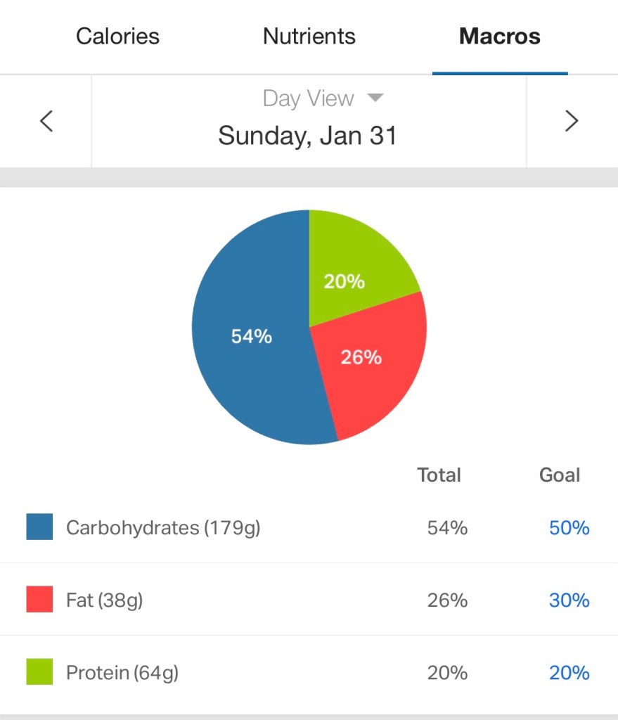 Lately, I’ve been focusing more on tracking my food and calories, but I also check out my macros. Most days, even when I think I haven’t made all the best choices, my macros are close to perfect. (50% carbs, 20% protein, 30% fat) (*I know this seems like a lot of work, but it becomes second nature pretty quickly, and I definitely see results when I track what I eat.)
