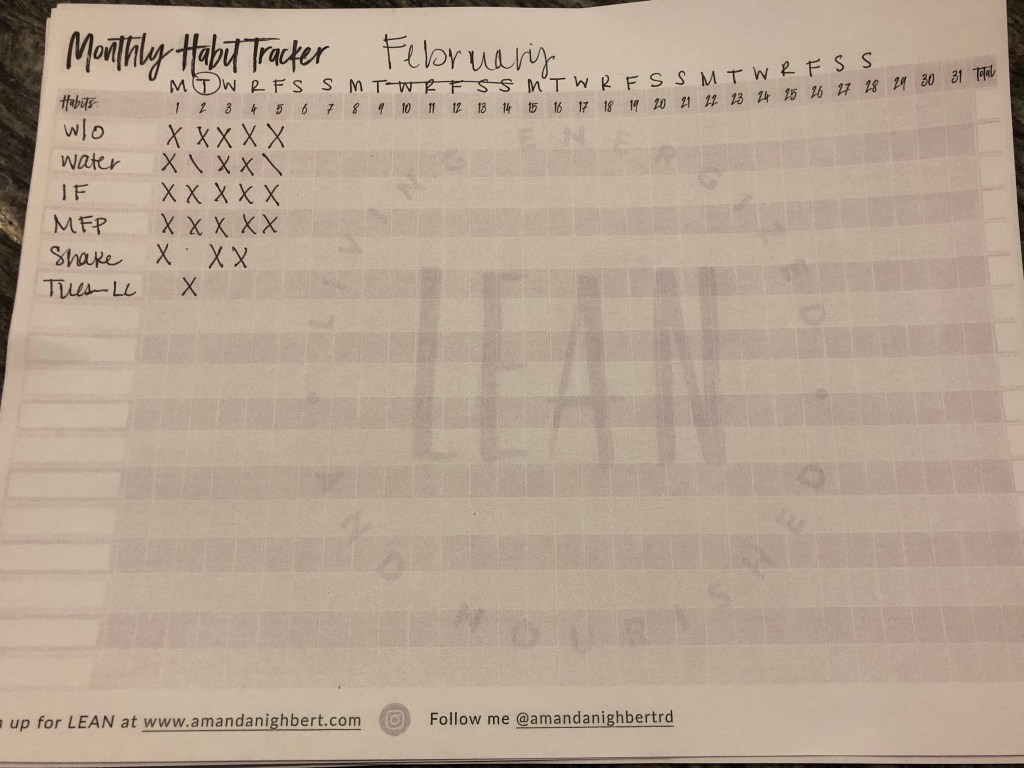 I’ve used strategies from Amanda Nighbert’s Lean program for years. I’ve been carb cycling and intermittent fasting pretty consistently for four years. Back in November, she shared this chart, and I printed it out to write my monthly goals.
