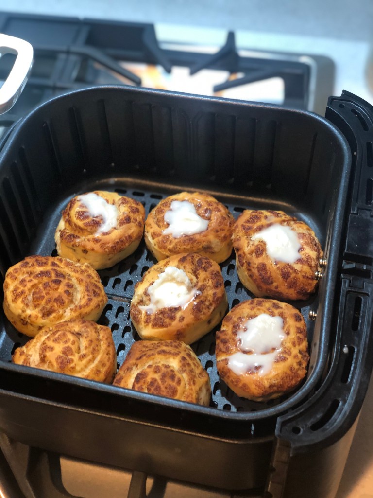 What I love about the “recipe”from Pinterest is that they said to not even preheat the air fryer. So the cinnamon rolls really were finished in 5 min. I was so excited it worked out. Have a great weekend!