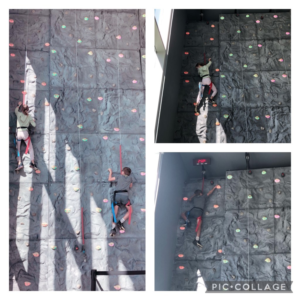 and then the kids tried the rock climbing wall. Hadley scaled the wall in a minute and 37 seconds. Hayden took a couple of tries, and then made it to the top.
