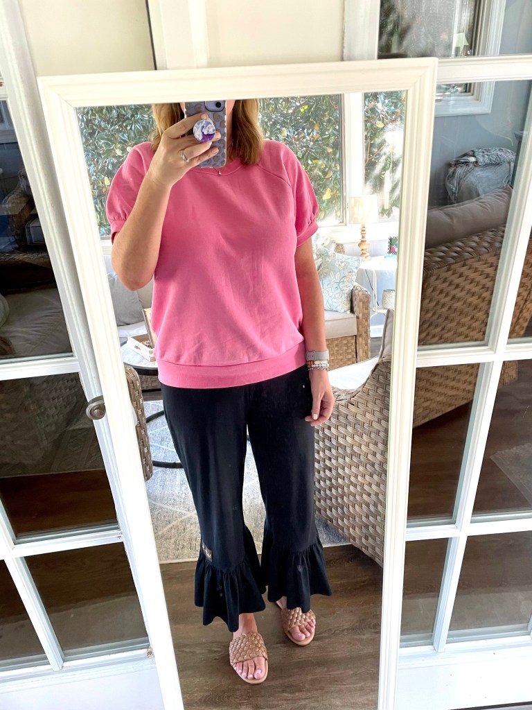 The light weight sweater and short sleeve sweatshirt have been perfect for cooler summer days. I’ve worn both with shorts, jeans, and even my favorite Matilda Jane ruffle pants.