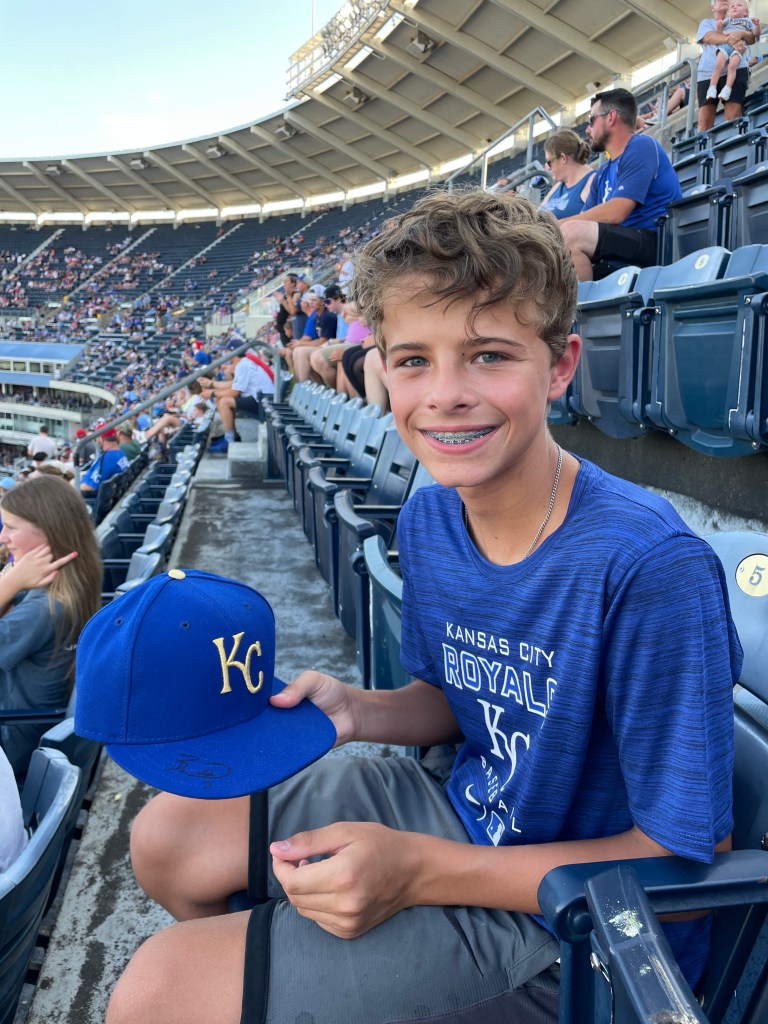 Hayden and Travis walked around before the game started, and Hayden was pumped because he got Bobby Witt Jr.’s autograph on his new hat!