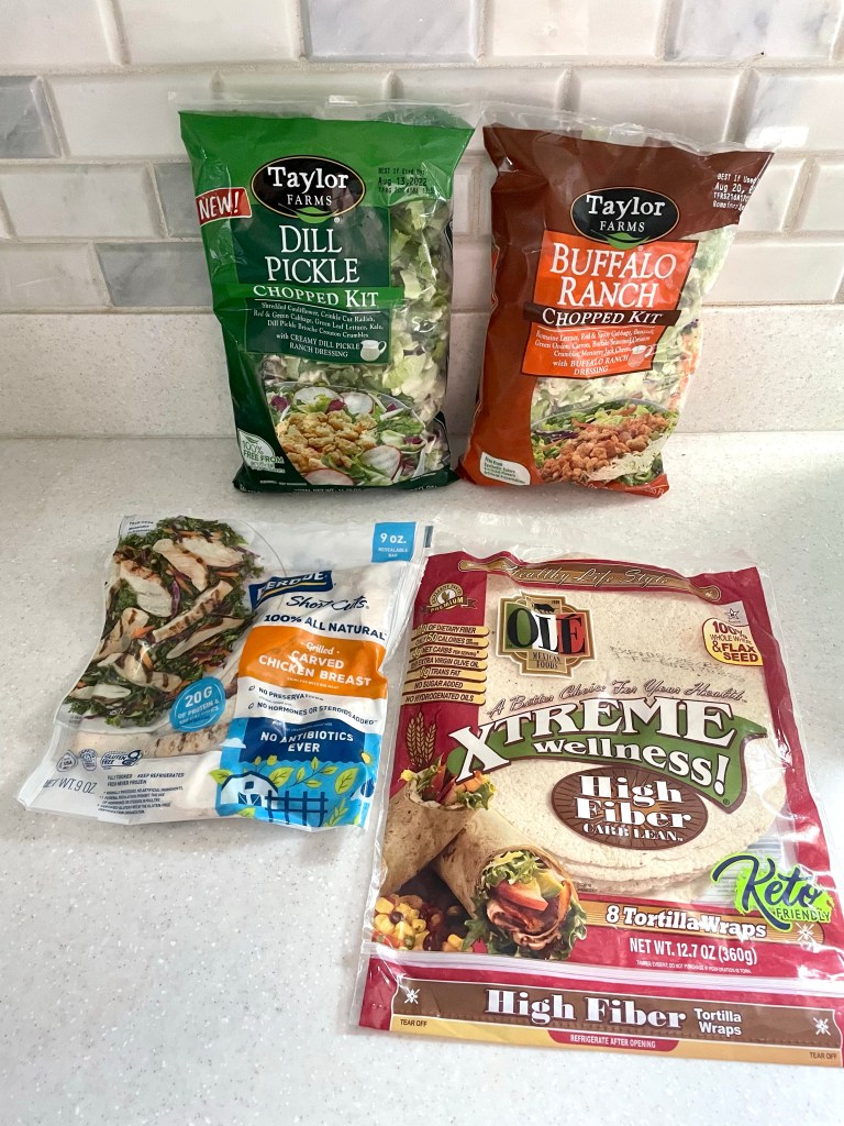 I saw a reel shared on Instagram about turning these salads into wraps. The reel featured four Taylor Farms salads (all of which I eat pretty regularly): Dill Pickle (so good!), Buffalo Ranch (yum!), Caesar (classic!), and Avocado Ranch (delish!).