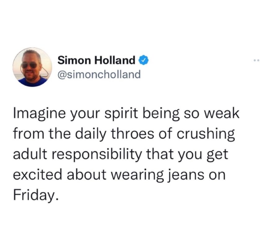 I always joke that I start strong on Mondays and am in jeans by Friday!