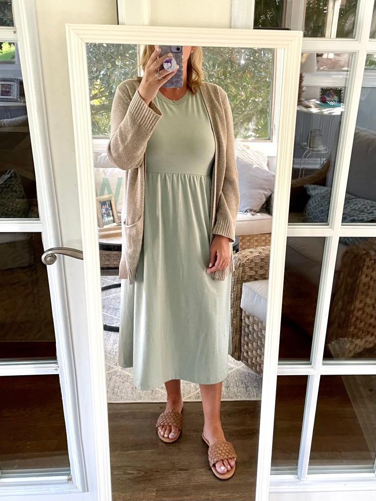 Target for the win again. I love this sleeveless knit ballet dress in light green (limited stock in taupe). This light-weight cardigan is from my latest Stitch Fix haul, and I wore my favorite woven Amazon sandals from last summer.