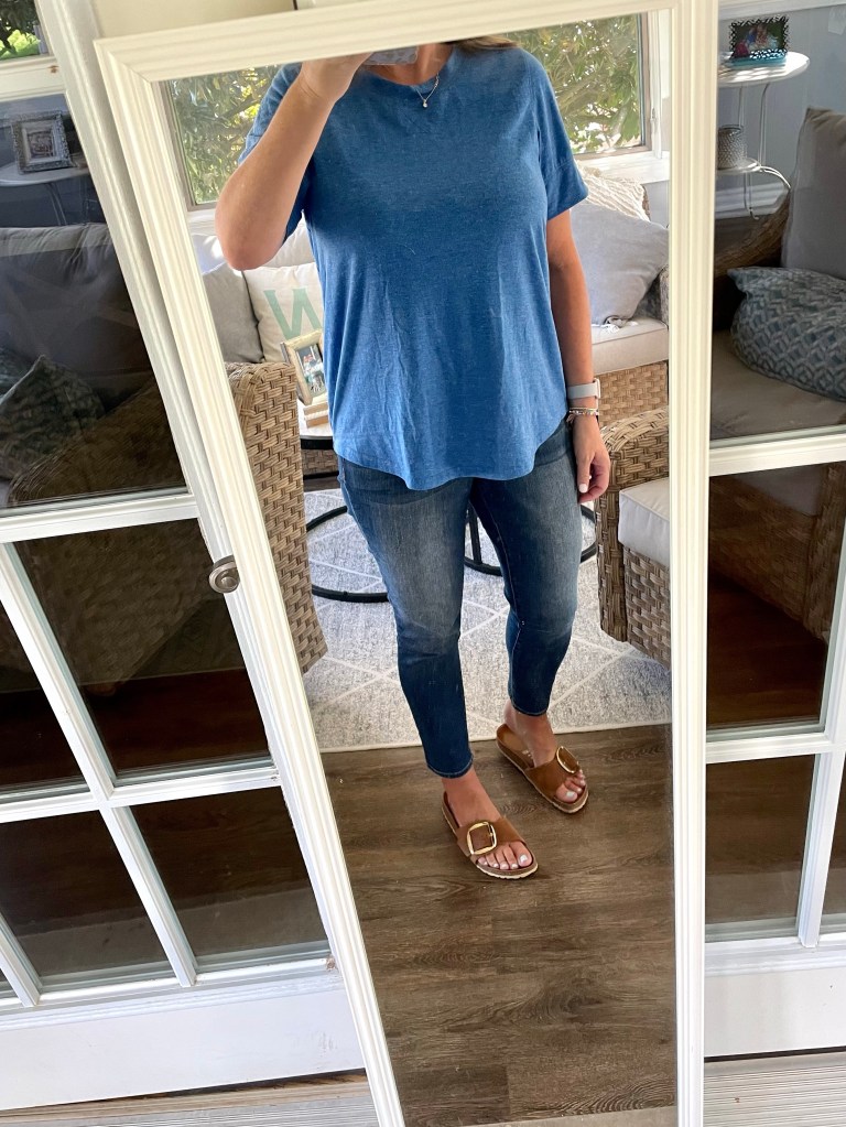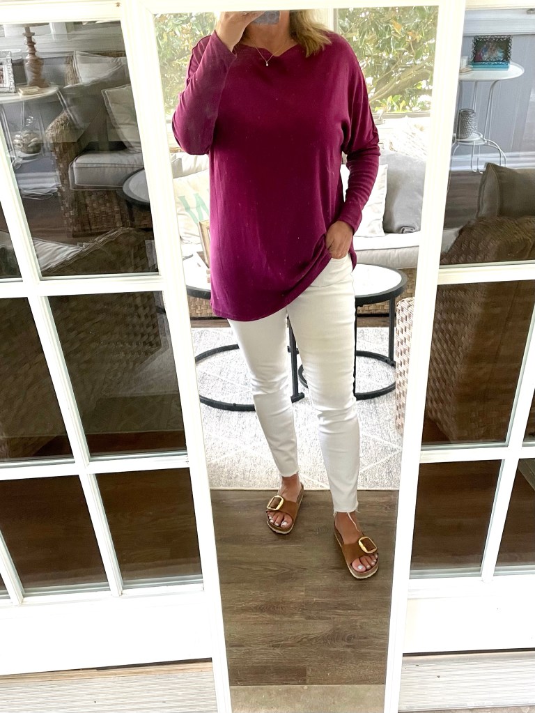 I really prefer dresses in late summer/fall. They are the comfiest for me, and I embrace my tan while I can. That being said, this tunic top is one of my favorites because it can be worn with leggings, and then I also have worn it with jeans. Yesterday, I paired it with my white denim from Old Navy (I shared this post last spring, but I don’t think these are in stock anymore) and, you guessed it…my Nordstrom sandals.