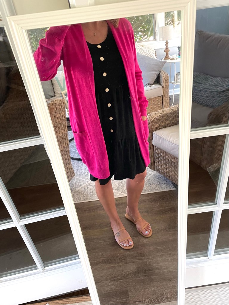 When I purchased this Amazon dress before vacay, I knew I’d be able to pair it with a cardigan once I got back to school. I’ve shared this cardi before, and I have it in two colors. I also wore my comfy simple strap Amazon sandals. (sized up 1/2 a size) Literally, this entire outfit brought to you by Amazon!