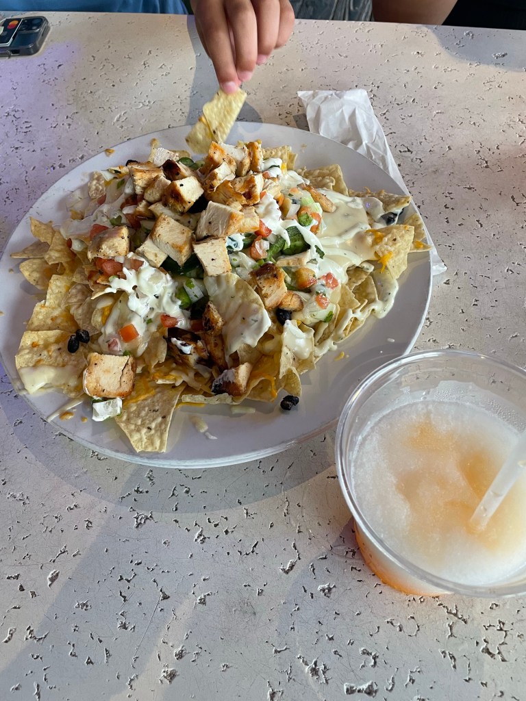 Then, we headed to the Daiquiri Deck which is a fave. We were so hungry, so we split some chicken nachos, and then ordered food for dinner too…as well a a daiquiri…(virgin for the girls, of course)