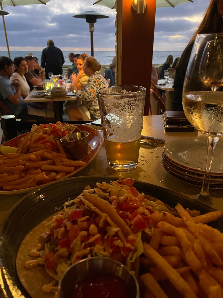 …to a restaurant on the beach called Poseidon. We eat there most every time we go to Del Mar. We ended up seeing one of Trav’s clients, and some Lexington people. I had fish tacos for dinner, and the sunset over the ocean was pretty.