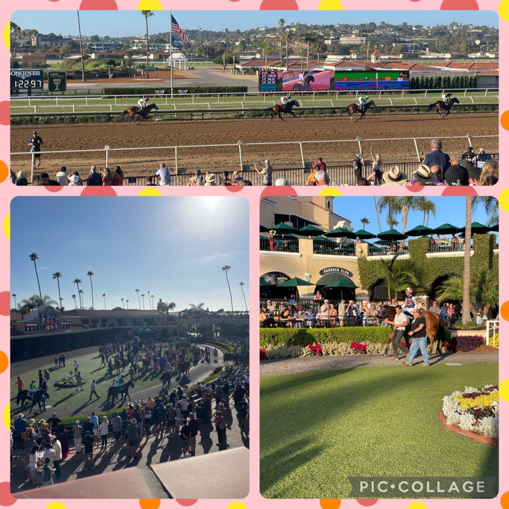 …before heading to Del Mar Race Track. The weather was beautiful, and we hung out on the veranda for a bit. Then, we watched some races from a box and even went to the paddock to check on one of the horses before the race. Beer Can Man placed second; he lost by a nose.