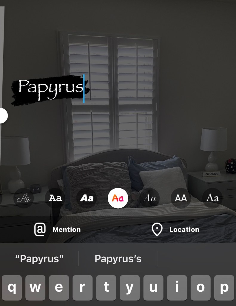 Papyrus is one of my favorite fonts. Well, on Instagram, Jen Reed was talking about how if you are sharing a story and go to the 4th font from the end, and type “Papyrus,” the writing will change to that cute cursive-y font!