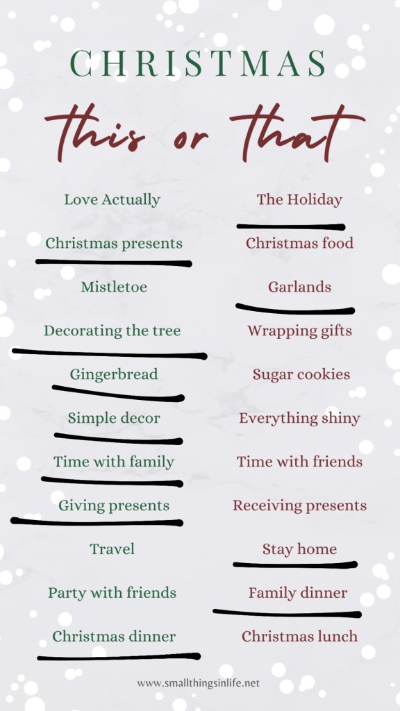 I like to write a “this or that” post during the various holiday seasons, but never got around to it. So, here are my answers to this fun one I found on Pinterest: