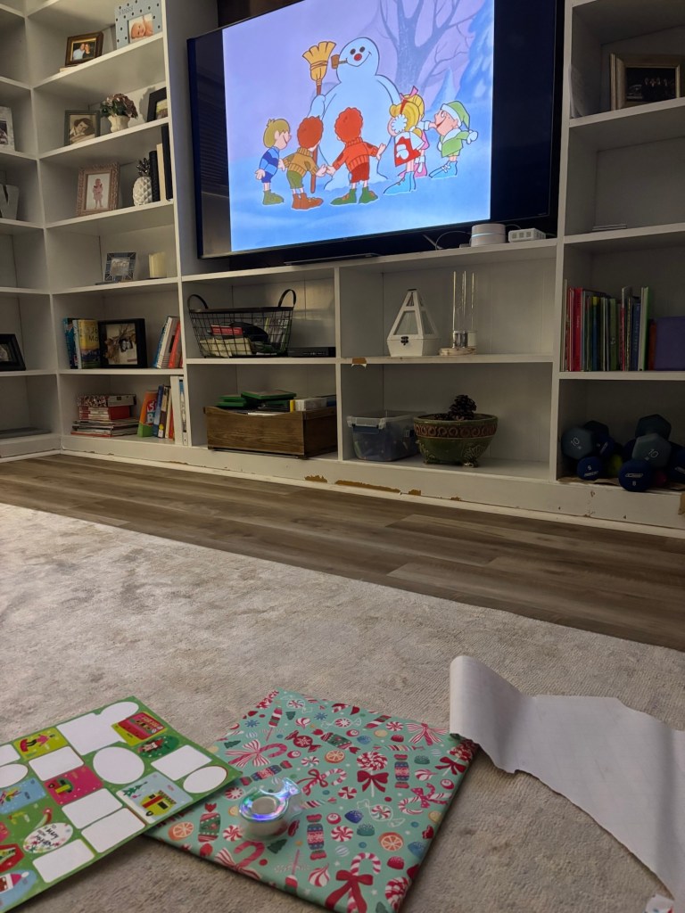 On Sunday, I finished wrapping presents while watching Frosty the Snowman. I don’t love wrapping presents, so I just carve out some time once or twice in December to get everything organized and wrapped. Watching a holiday show makes that task more tolerable.