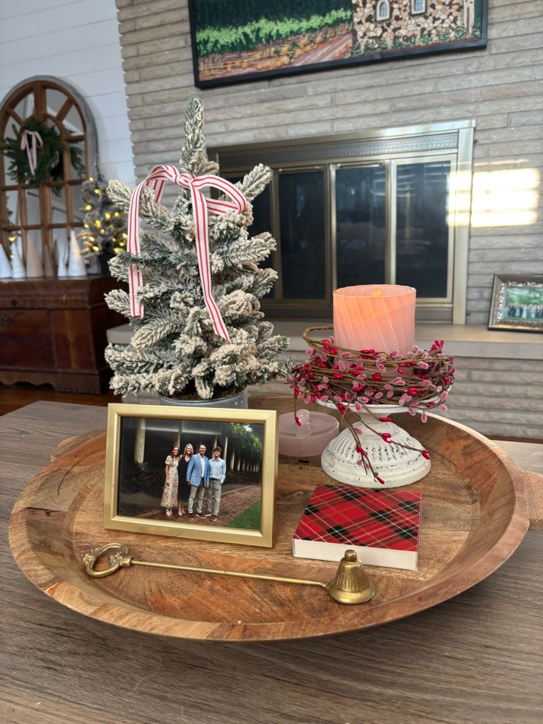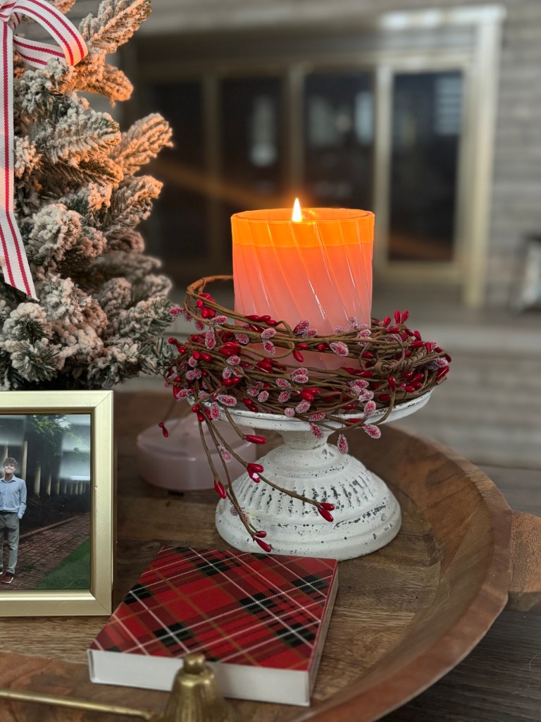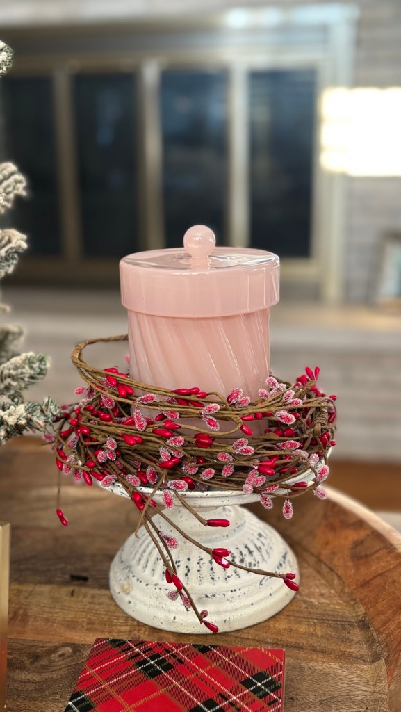 I saw this wooden serving tray and Michael’s and thought it would be perfect in this little corner of the kitchen. I usually have a cook book in this stand, so that was an easy swap. My friend gave me the cute heart icon candle from Aldi for my birthday, and I added it to a metal pedestal that I have out year round but also added the cute little red and white plate from Target.