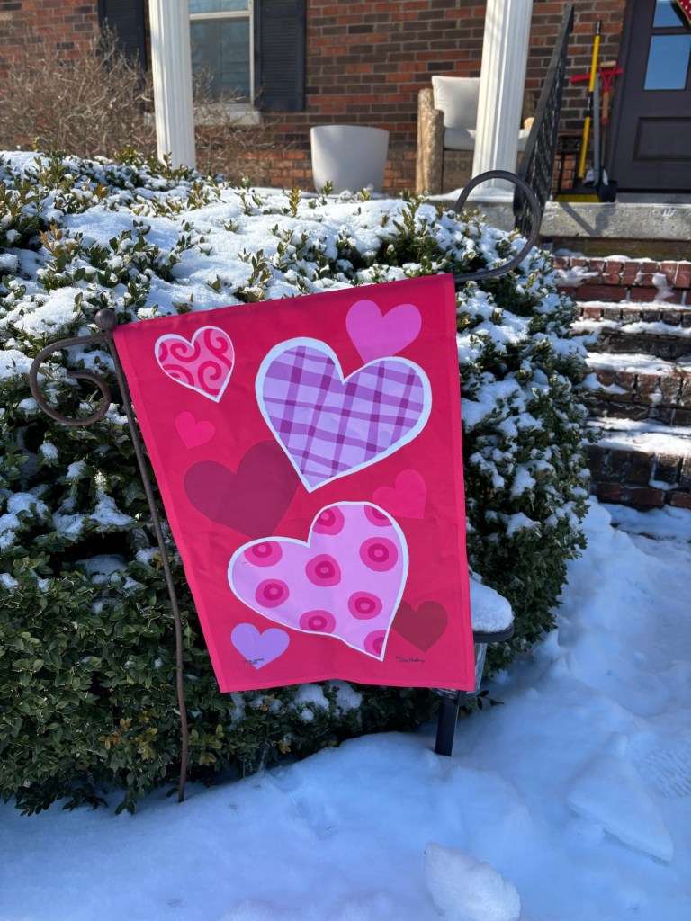 Outside, I swapped my “let it snow” flag (I think it did its job!) for my pretty pink and red Valentine’s Day flag.