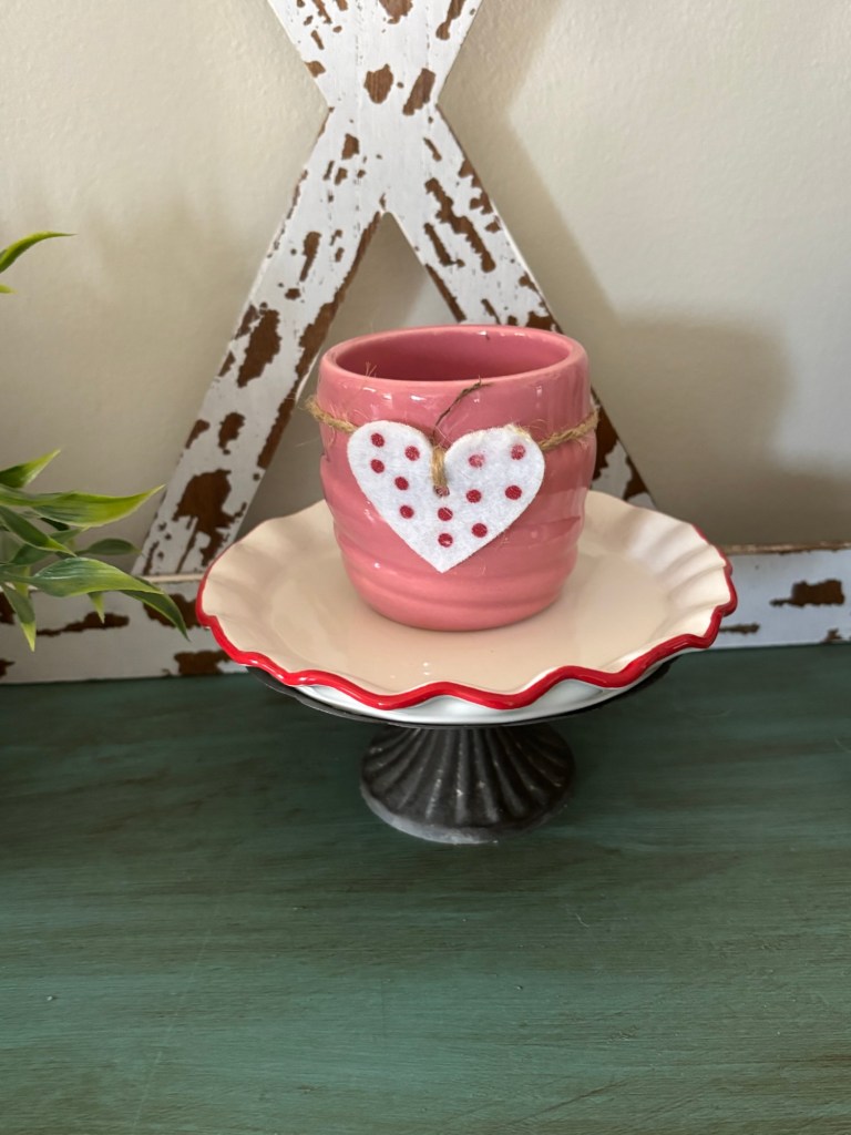 I really enjoy putting things out for Valentine’s Day…especially because set up and take down take five minutes each way!
