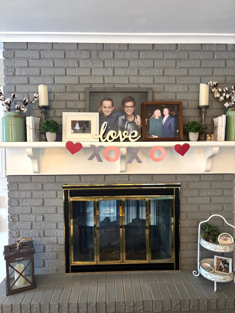 The mantel in the kitchen is the same as it’s been for quite a few years. I have the wooden “love” sign as well as an XOXO banner.