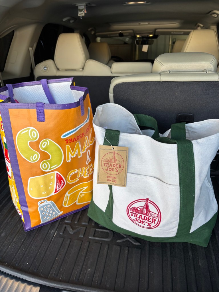 I’m not sure what took me so long to do so, but I finally bought a couple of bags at Trader Joe’s to haul my groceries in. We do like using the paper bags because we’ll use them for our recycling, but I do like having these bags, and they’ve come in handy for carrying my Kroger and Aldi groceries too.