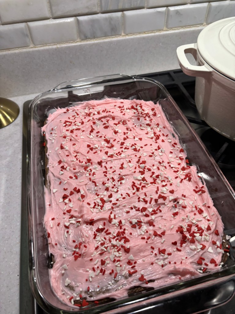 With the Chiefs not being in the Super Bowl, our Super Bowl traditions were all out of whack. We did still go to my brother’s house, but instead of ordering a cookie cake, I made Valentine’s Day(ish) brownies. They were a hit.