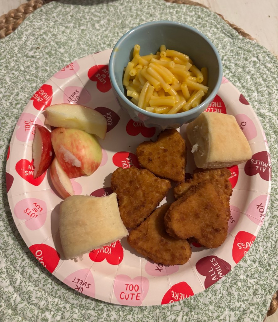 We have a lot going on this weekend, so I went ahead and made our “Valentine’s Day” family dinner last night. Heart shaped chicken nuggets for the win!