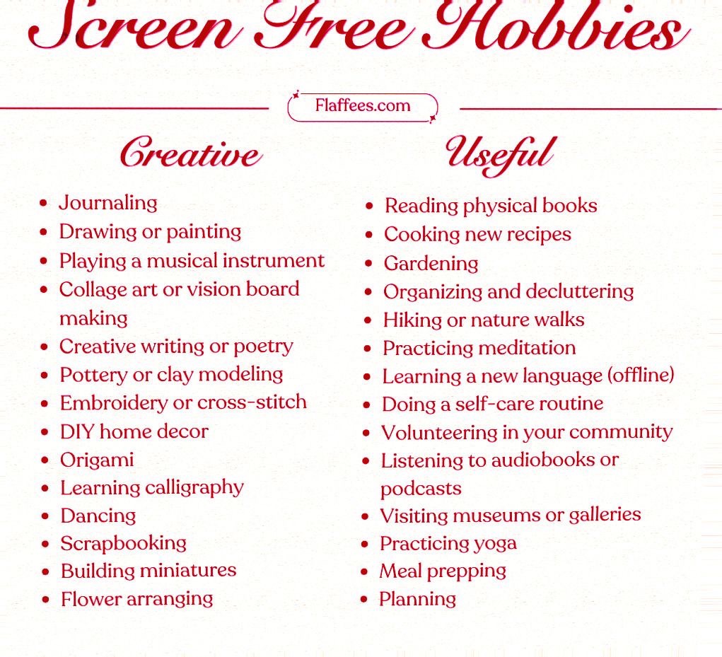 I have lots of screen free hobbies– reading, painting, scrapbooking, card making, cooking, baking, hiking, going to the gym, etc.