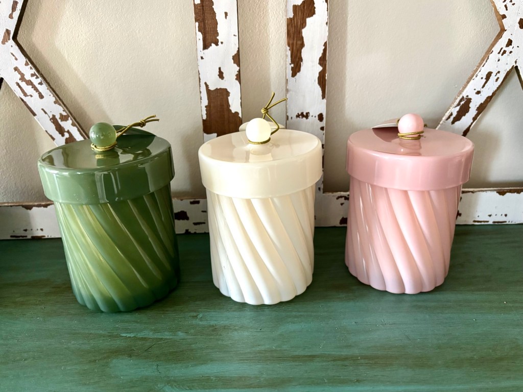Well, again, I will share my latest obsession —these candles! In the past month, I’ve purchased two pink (pink lady and peony) and then a green (honeyed pistachio) and white (amber sunrise) candle. I’m currently burning the green one, and I love it. My store still had them in stock.