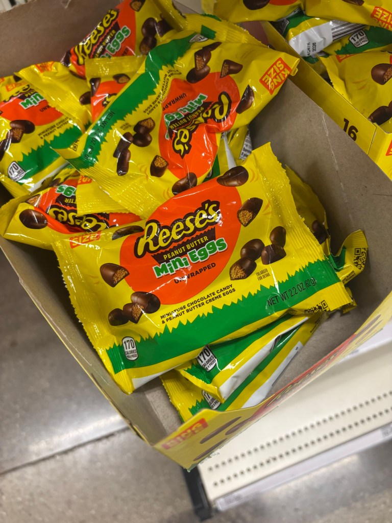 Have you all seen these? Little mini Reese’s eggs! Don’t tell my kids, but I picked up two packs and put them in my school fridge for snacking! haha!