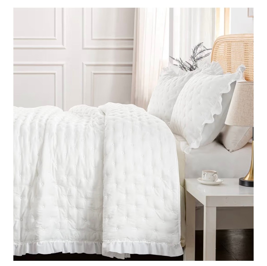 …and speaking of blankets…when we redid Hadley’s room two years ago, I got her a quilt from Home Goods to go under her comforter. It held up ok, but it’s been pilling more and more, so I used a gift card to order her this coverlet, and I’m pleased with it. It’s lightweight, so soft, and I ordered it because I liked the ruffle detail. It’s just what she needs for an updated quilt for under her comforter. She loves layers of bedding!