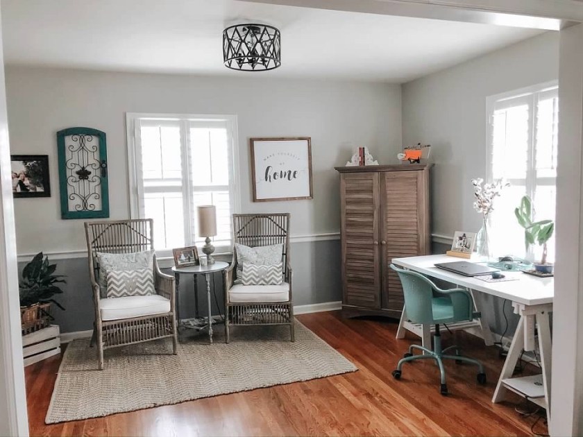 I wrote this post back in 2020 sharing how we updated the living room and dining (office) space. The space serves our needs. Since we all have laptops, we can all kind of work wherever we choose, but it’s nice having the cabinet for storage (school supplies, envelopes, chargers, etc) and the bigger desk if we ever need more space.