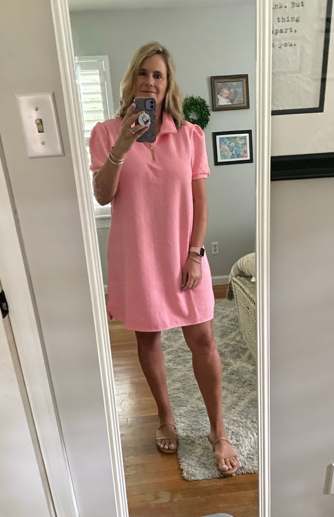 This pink dress was a SSYS “Saturday Steal,” and I’ve worn it quite a few times. Again, if I wear a sleeveless dress, I usually wear a cardigan…because my classroom runs hot and cold. Also, it’s perfect because it has two pockets…so when I leave my classroom, I put my phone in one and my keys in the other!