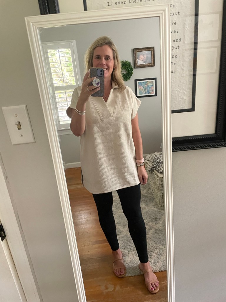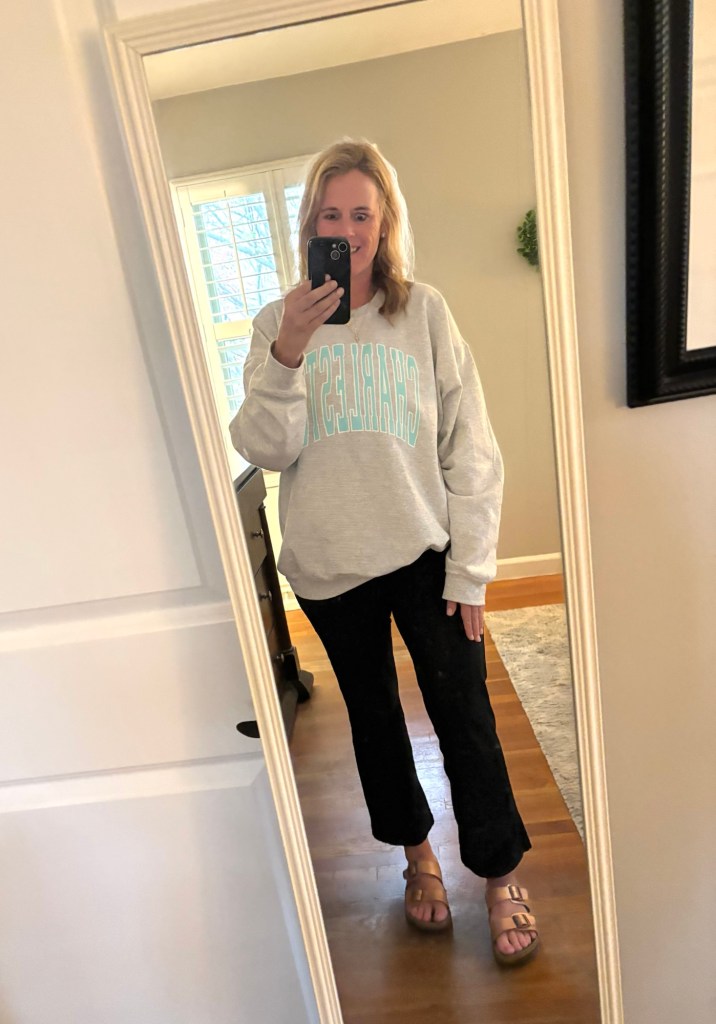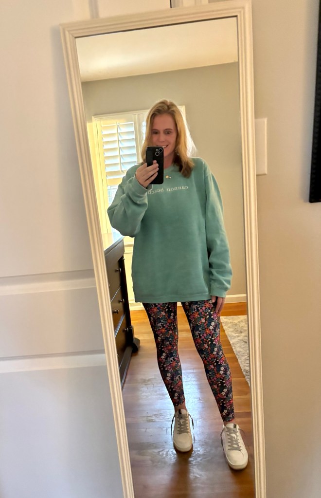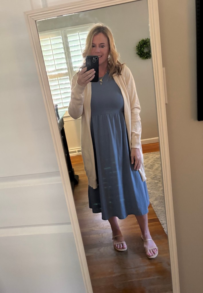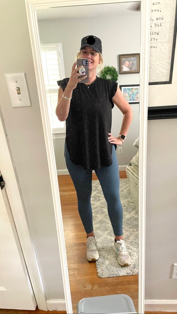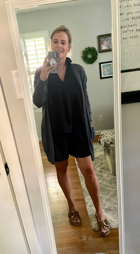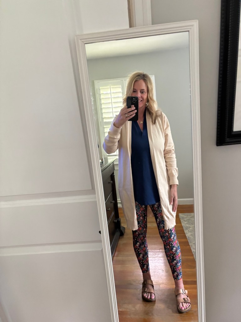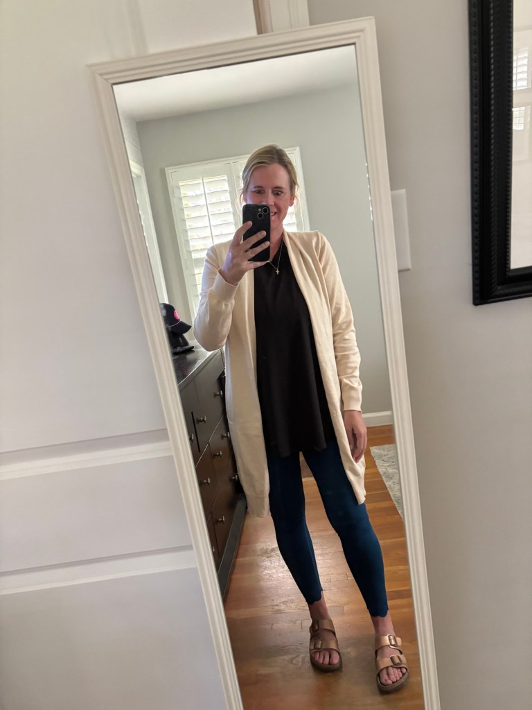 I’m starting off strong with a very casual outfit. I’d come home from school and changed into something comfy for Hadley’s volleyball game. One of my favorite SSYS t-shirts and leggings, Amazon sandals, and my favorite Amazon cardigan in case the gym was drafty.