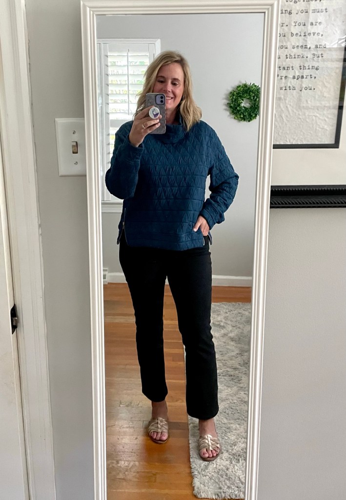 The Ava quilted pullover is another fave. I’ve worn it quite a few times over the past year. I love the side zippers and the funnel neck collar. I wore the SSYS sleeveless poplin undershirt which is perfect because it’s fitted but then you have the cute collar. For shoes, I wore my favorite Amazon flats that I have in black and in tan.