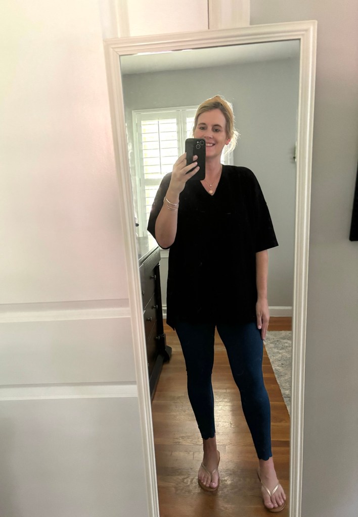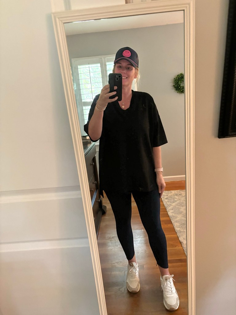This is a pic from a few months ago, but I wore this exact outfit a couple of times. I love the SSYS scallop leggings, and the over-sized v neck t-shirt is their “air fabric” which is so soft.