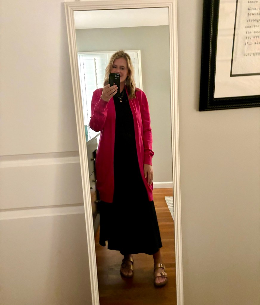 Yesterday, I wore a long sleeveless black dress that I got at Target years ago with my favorite Amazon cardigan and sandals.