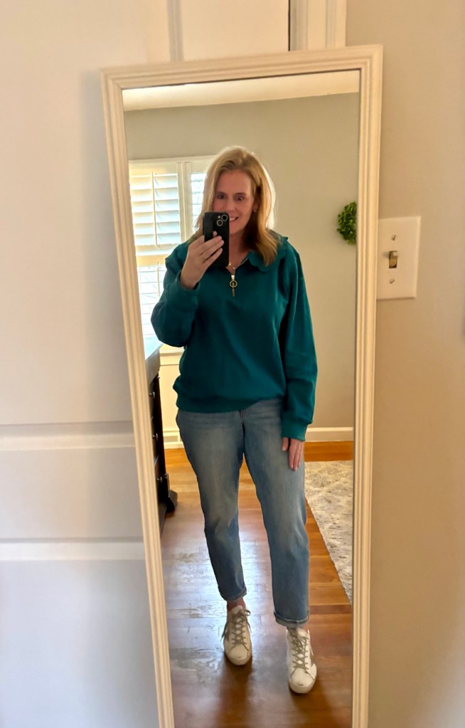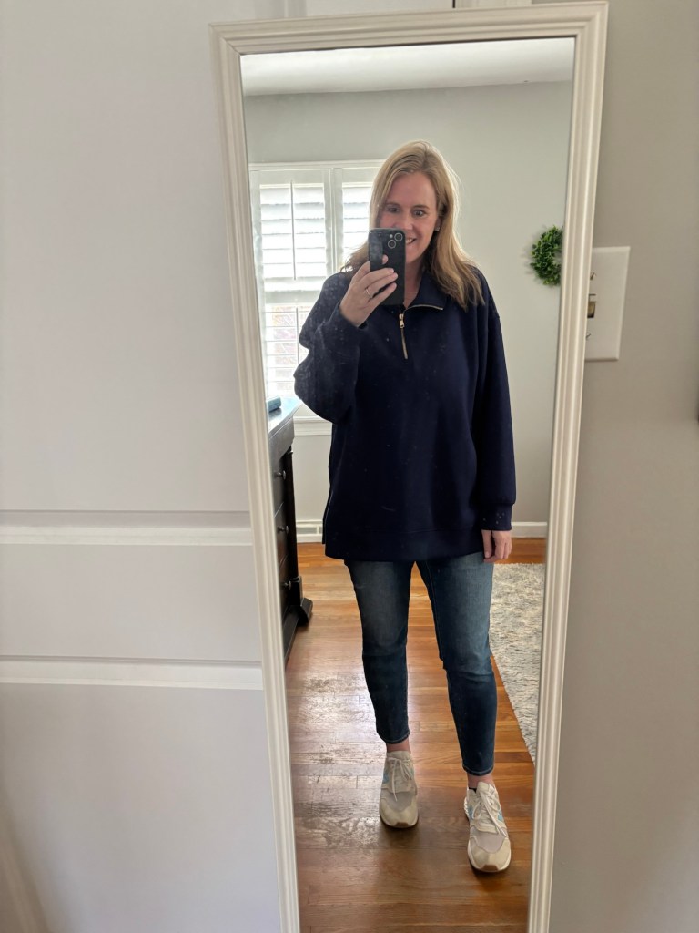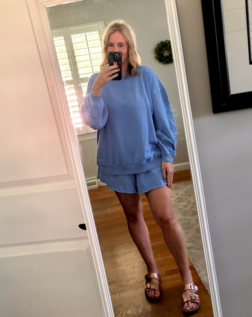 I was highly influenced by Amy when she shared her Aerie finds. Cornflower blue is my favorite color recently, so I just knew I needed to snag this sweatshirt. Aerie was having a sale, so I snagged the shorts too! I probably could have sized down in both, but I rolled the shorts once, and they fit perfectly and I liked the length that way. And, as you know, I love an over-sized sweatshirt, so I’m keeping both as is.