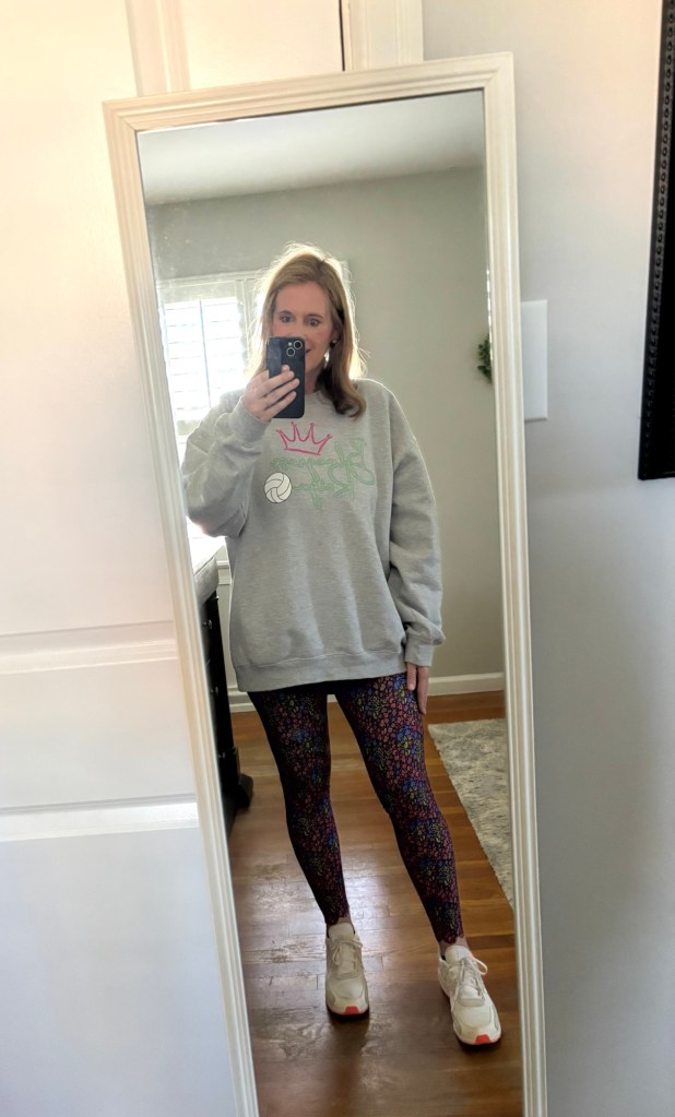 This pair of leggings is the pair I bought from the January athleisure drop. The compression on them is next level, but they are still super comfy. Since they match Hadley’s volleyball team’s logo, I wore them to her tournament a couple of weeks ago.