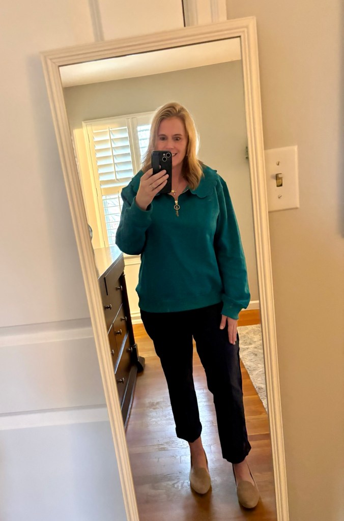 One of my returns was to Old Navy to return two pairs of pants I’d ordered. Well, I wasn’t sure of the sizing, so I ordered four pairs of these pants (in two different sizes) because they were on sale for $14. I ordered the navy and the black of this “kick flare” style, and I love them. They are leggings material, but I will most certainly be dressing them up and down. I did end up with my true size, and I don’t regret this purchase one bit!