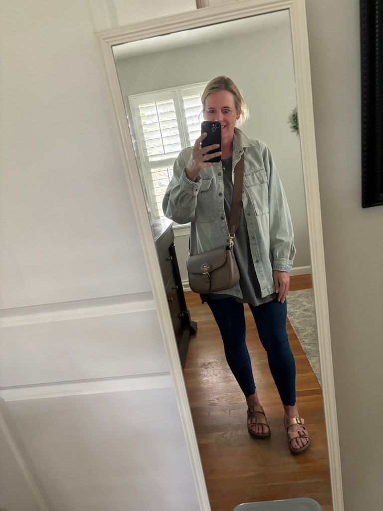 For Hadley’s volleyball games, I wore SSYS leggings, my favorite Amazon t-shirt, and the SSYS shacket (shirt/jacket combo). The shacket is an SSYS label piece that they’ve sold over the past couple of years. I finally decided to buy one at the beginning of the year, and it arrived, I put it on and wasn’t sure it was for me….but then I threw it on and decided to give it a try, and there’s no looking back. I love it. I’ve worn it mostly casually, but I’ve also worn it to school with pants and a blouse. I know I’ll wear it with dresses once the weather is warm enough. It’s truly become one of my favorite staple pieces in my wardrobe.