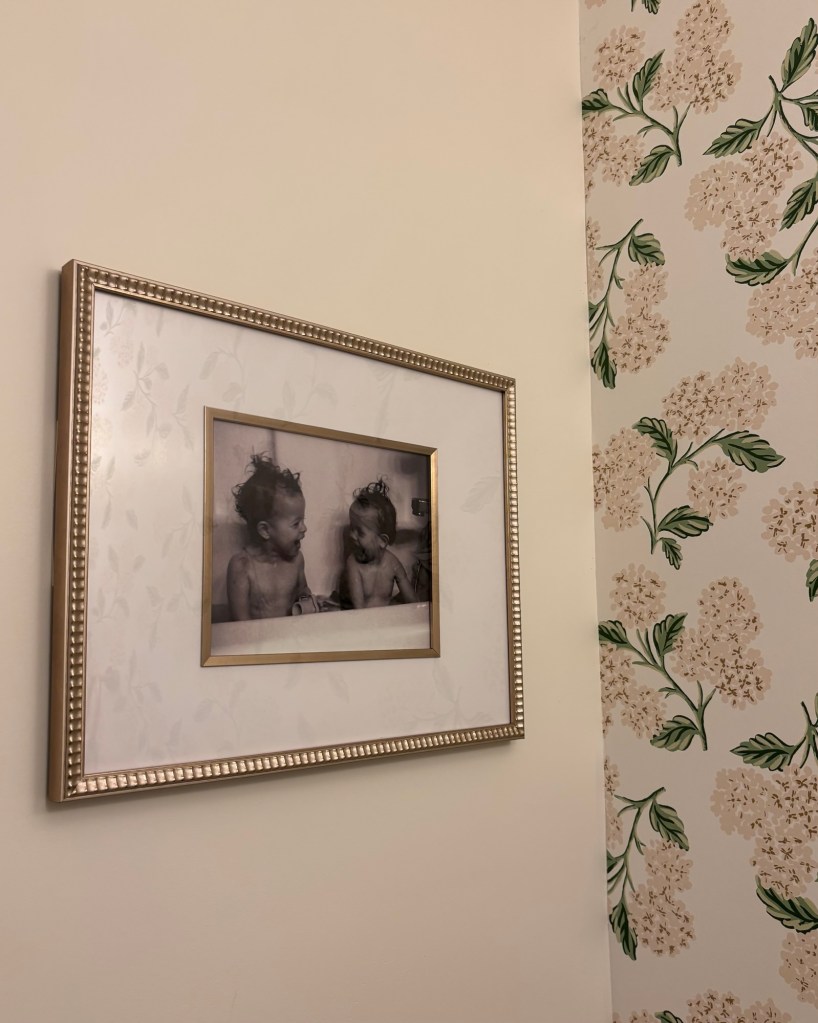 We had one more update to the hall bathroom. This picture of the kids in the bathtub is one of my faves. We had it in a simple black frame, and once we put the bathroom back together, I wasn’t sure what do to with the photo. Trav even told me I had to find a place for it in the new bathroom because it’s just a favorite of ours. So, I found this pretty gold frame at Michael’s and we hung it this week. It’s the perfect finishing touch to this small blank wall.