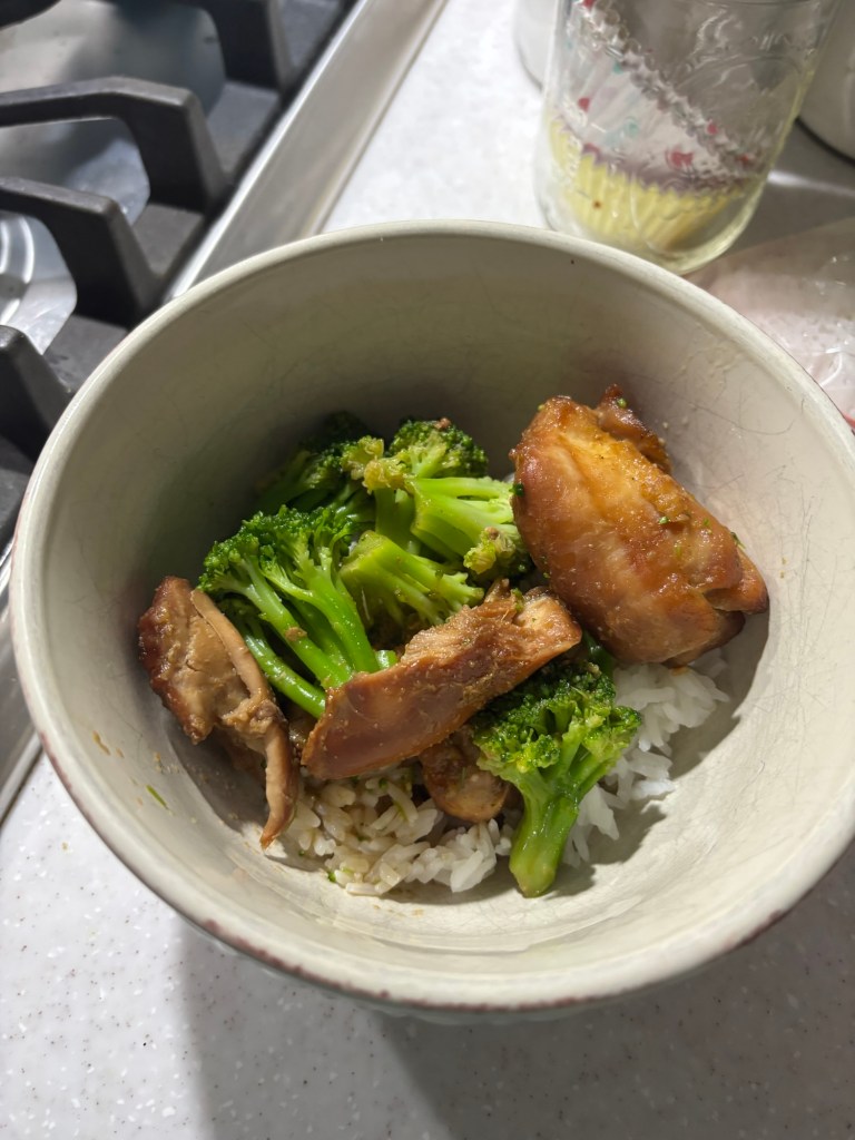 Cook on low for four hours. Then, I steamed frozen broccoli in the microwave and when it was time to eat, I added the broccoli to the slow cooker. I microwaved Trader Joe’s Jasmine rice, and served dinner on the cooked rice.